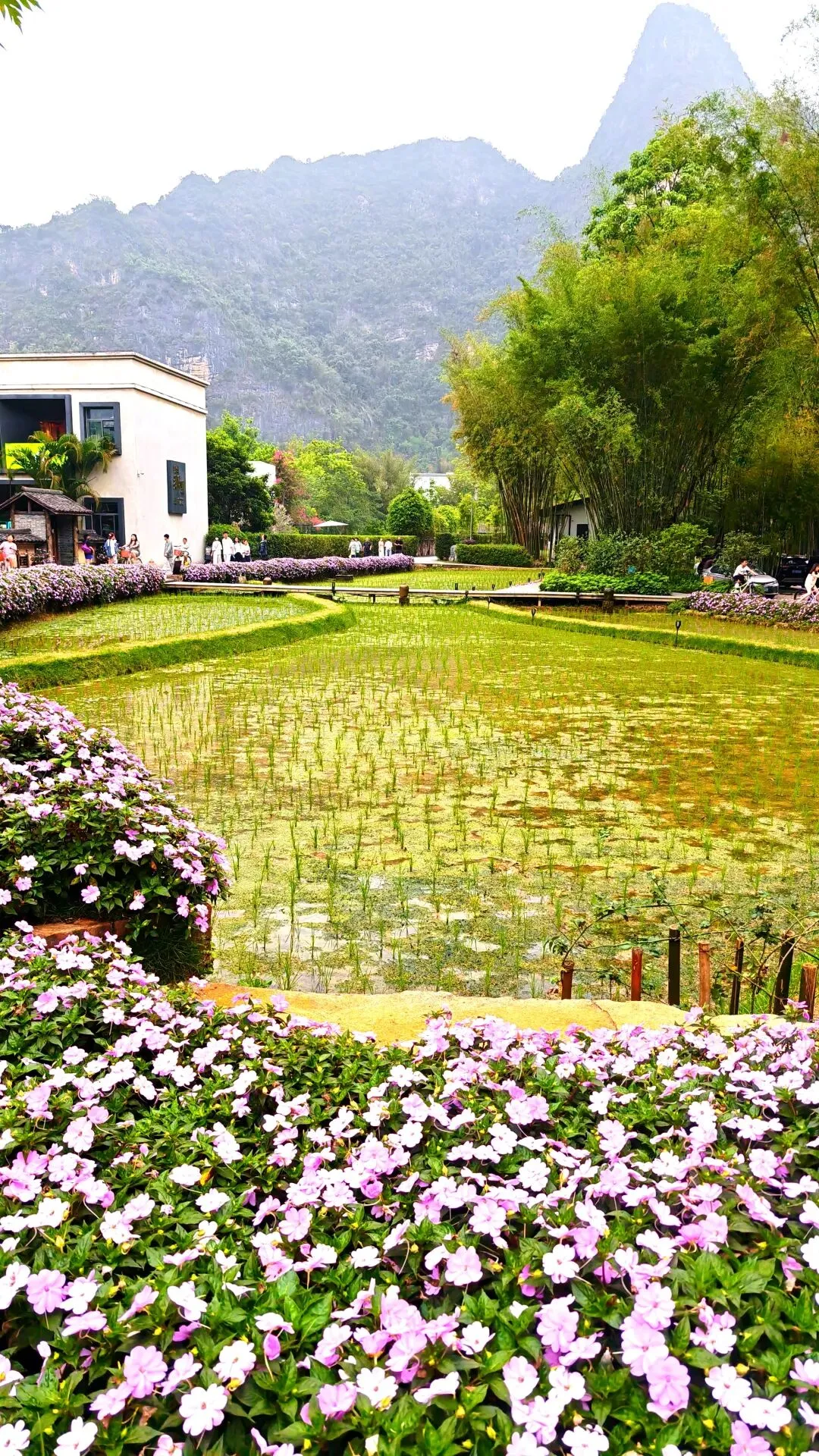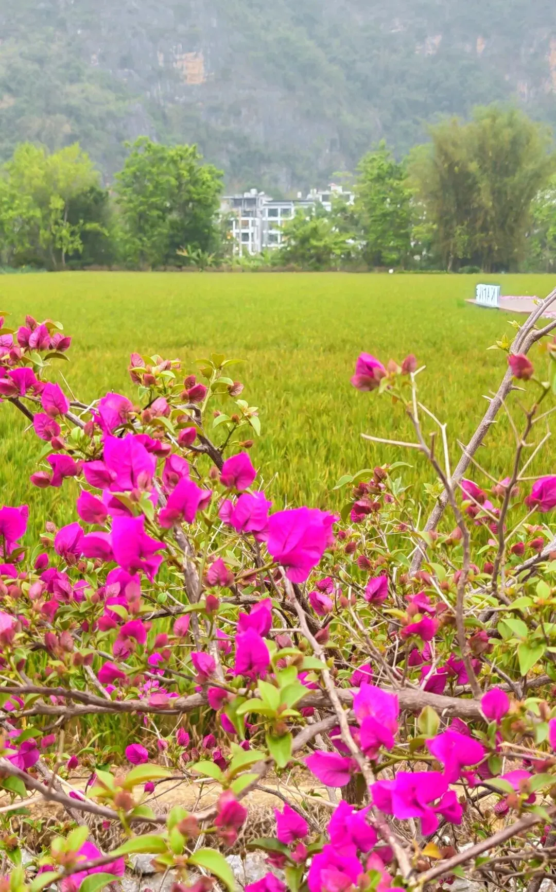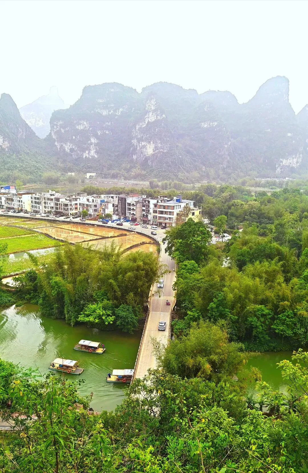 我们站在观景台上,把蜿蜒的明仕河、如茵的稻田、点缀的农舍以及环绕的喀斯特峰林尽收眼底,宛如一幅巨大的山水画卷。此处应该是拍摄明仕田园全景照片的经典机位。