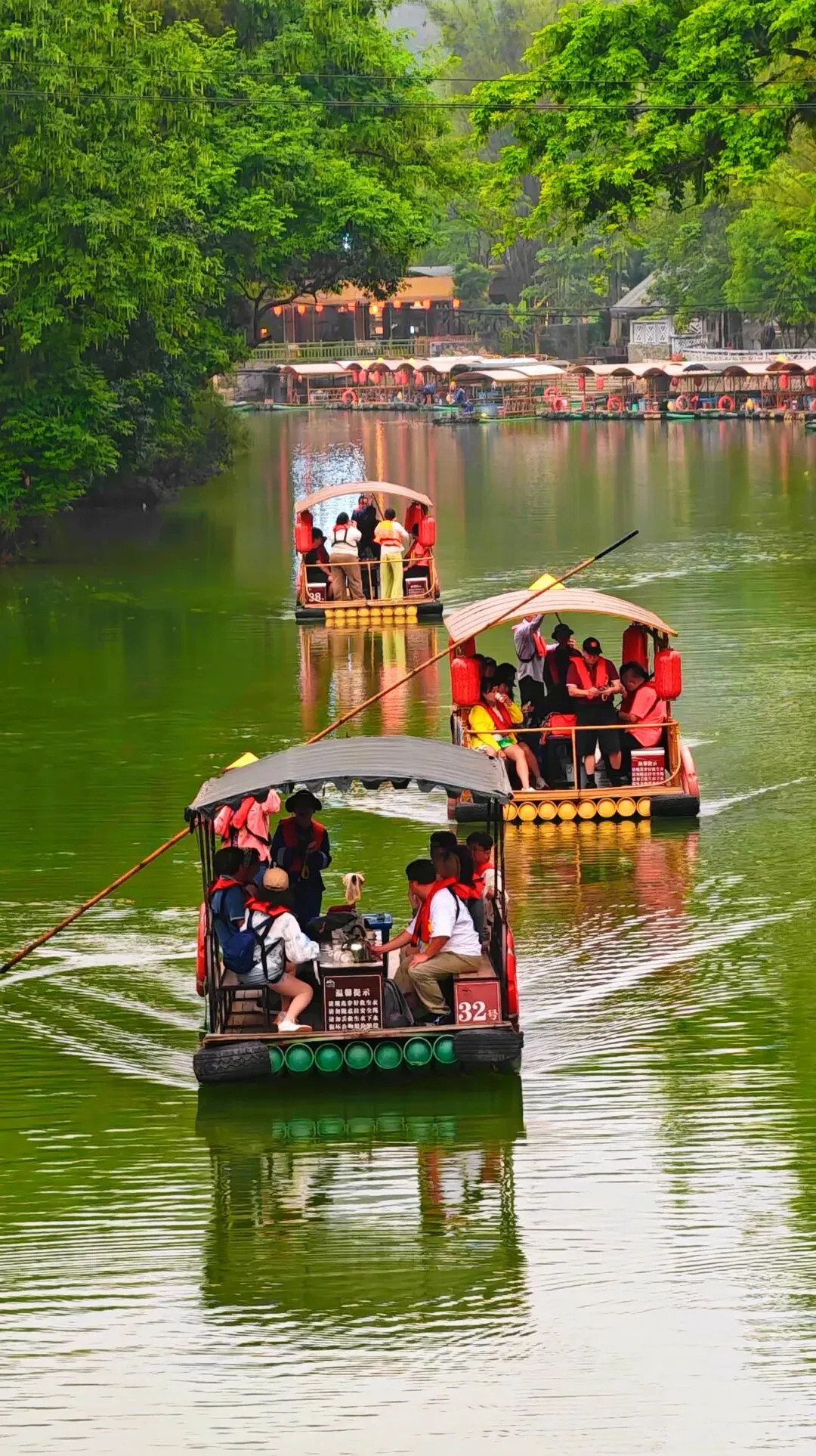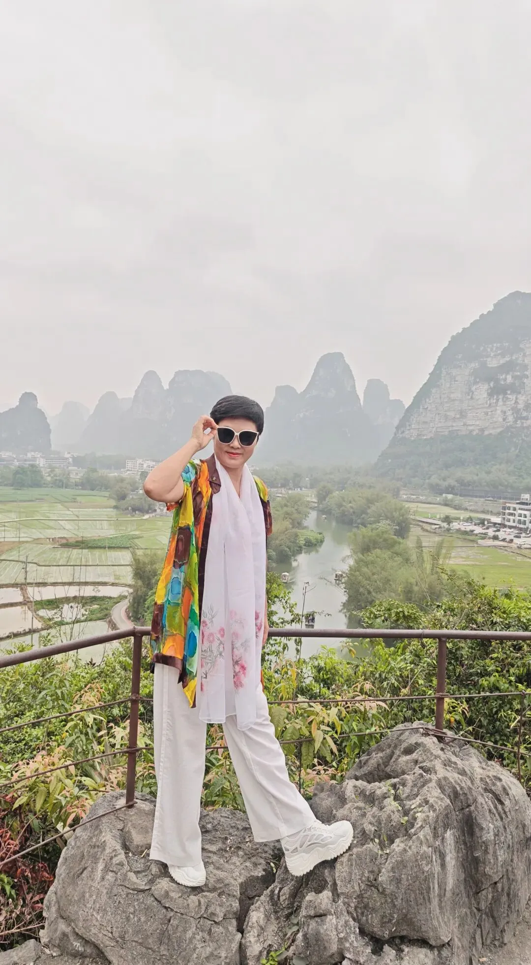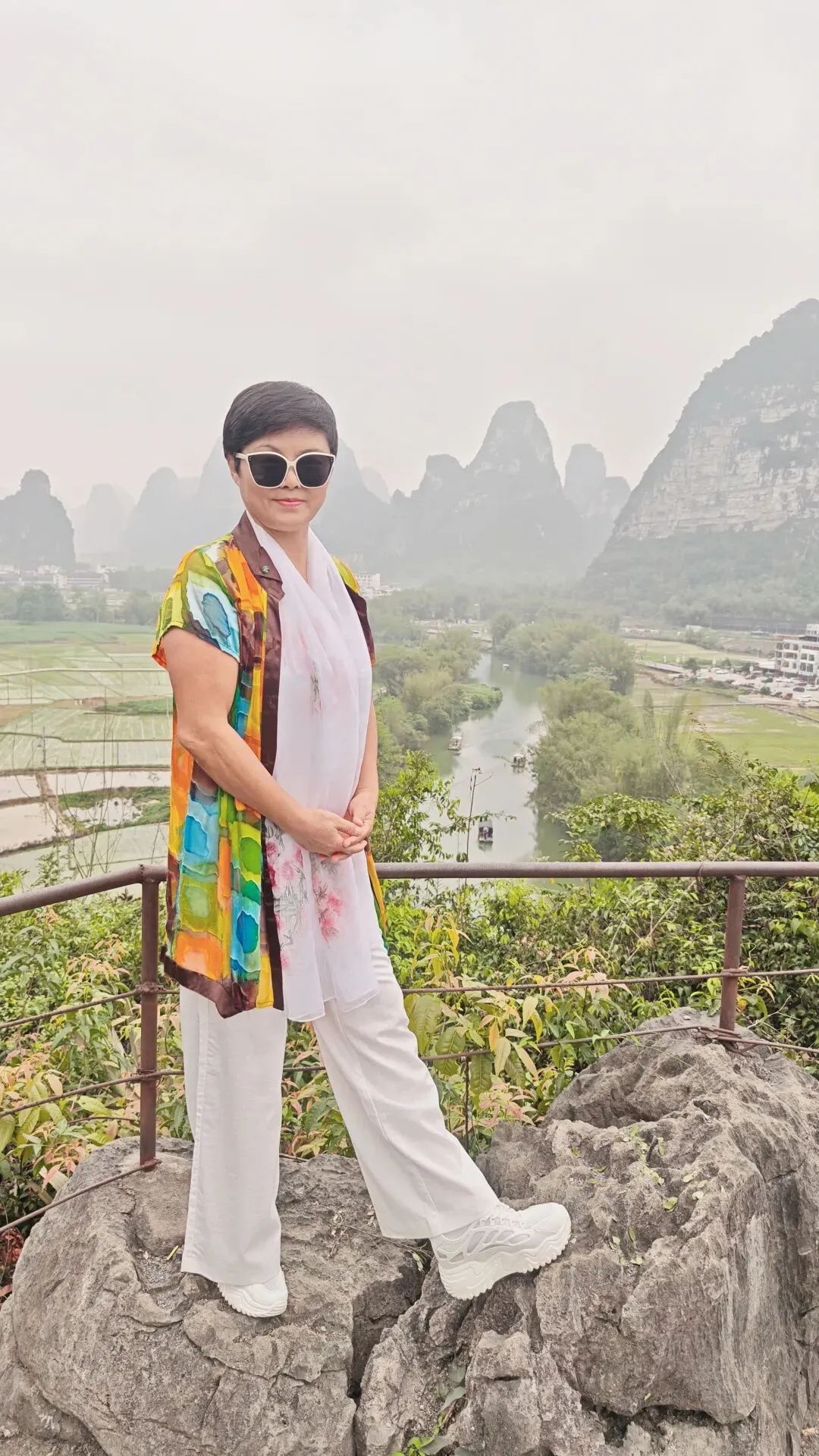 在观景台上我觉得最佳的观赏时间,应该是清晨和日落的时候。清晨,可观赏晨雾缭绕的静谧山水;傍晚日落时分,霞光将山峰、河流与田野染成粉紫色,整片天空被粉紫色云海包裹,千座峰林在霞光中仿佛巨兽蛰伏,随手一拍都是电影感大片,展现在游人眼前的应该是一幅尤为壮观的风景画,可惜今天的天气太不如人所愿。本想第二天早上来看日出,但无法确定明天是否晴天,也无法确认守门的老头几点上班,只能放弃此想法。