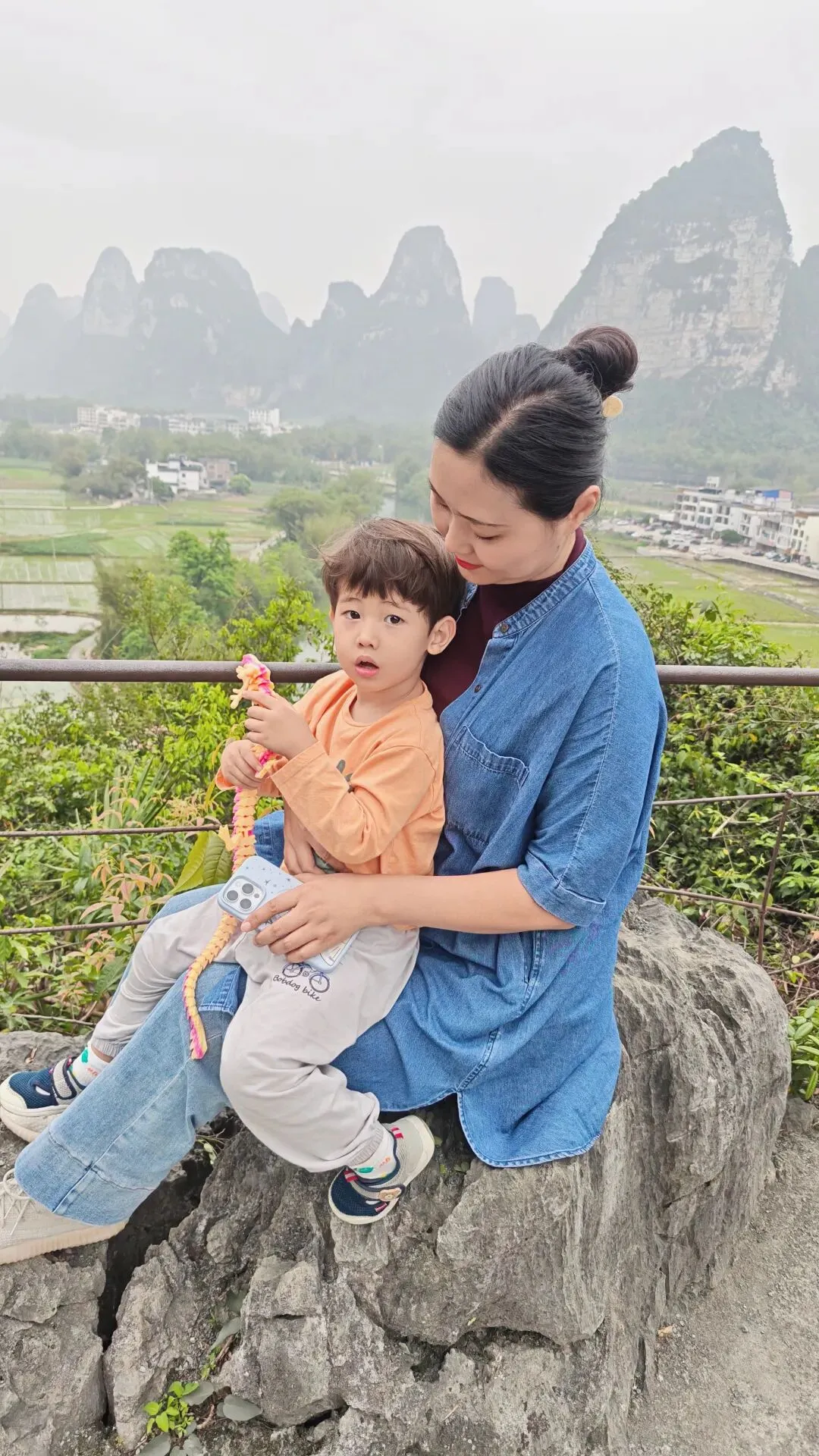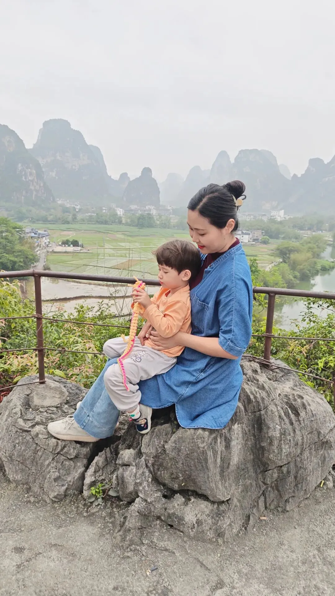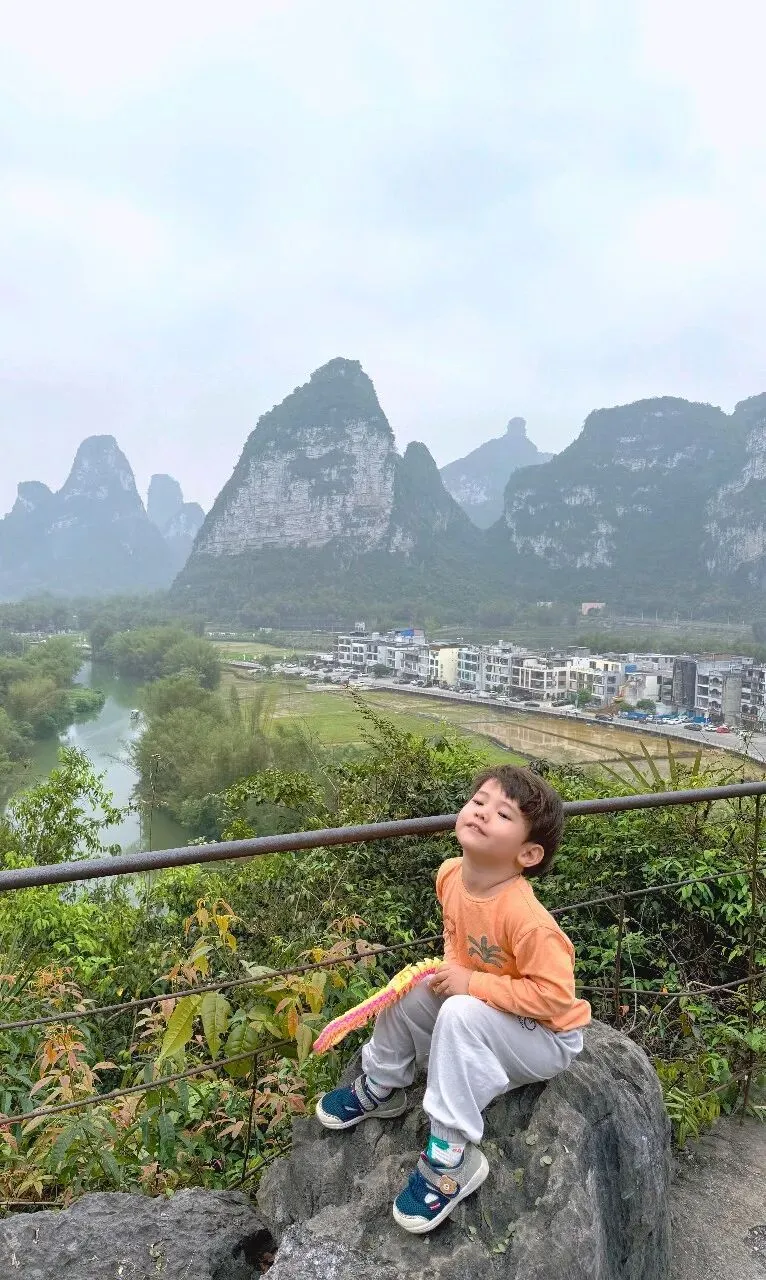 我看看那毫无特殊之处的铁门及门里面的状况,觉得一定是免费的。一家人走到门口刚想推门进去,那位貌似看闲的老头走了过来,说门票每人15元。我惊讶的问了一句,就这还要门票?老头笑着说,你上去就知道值这个钱了。我问有多高?老头说不高,也就100来米,就是有点陡。小宝姥爷嗤之以鼻,才100来米高,就算陡,眯着眼也上去了。我穿着10厘米高跟拖鞋,想着100米确实不算事。可是上了一段台阶后发现,真的很吃力。台阶太陡,我有三年没爬过山了,这么陡的上山台阶,走的非常吃力。从不运动锻炼的宝妈,更是走的上气不接下气,我虽然体力很棒,但也是气喘吁吁,小宝几乎不走都要姥爷抱着。一家老小就这大约100米的上山台阶,走走歇歇,歇歇走走,总算到了山顶观景台。站在龙头山观景台上,俯瞰整个明仕田园喀斯特山水的全景,的确如收门票的老头所说,景色绝佳,是观赏日出、日落的绝佳地点。只可惜今天是阴天且有雾气,那种瑰丽的落日余晖和晚霞是无缘相见了。