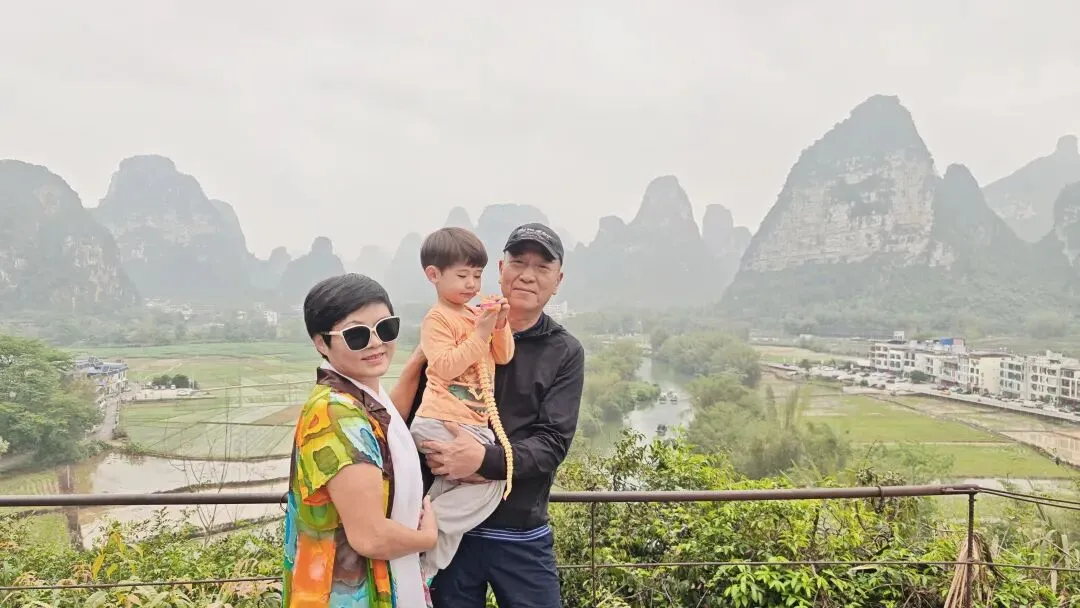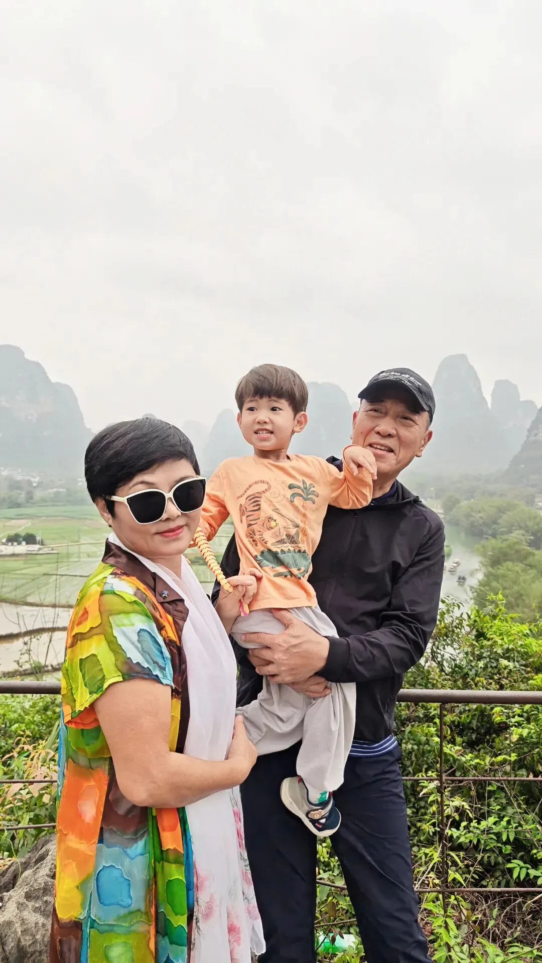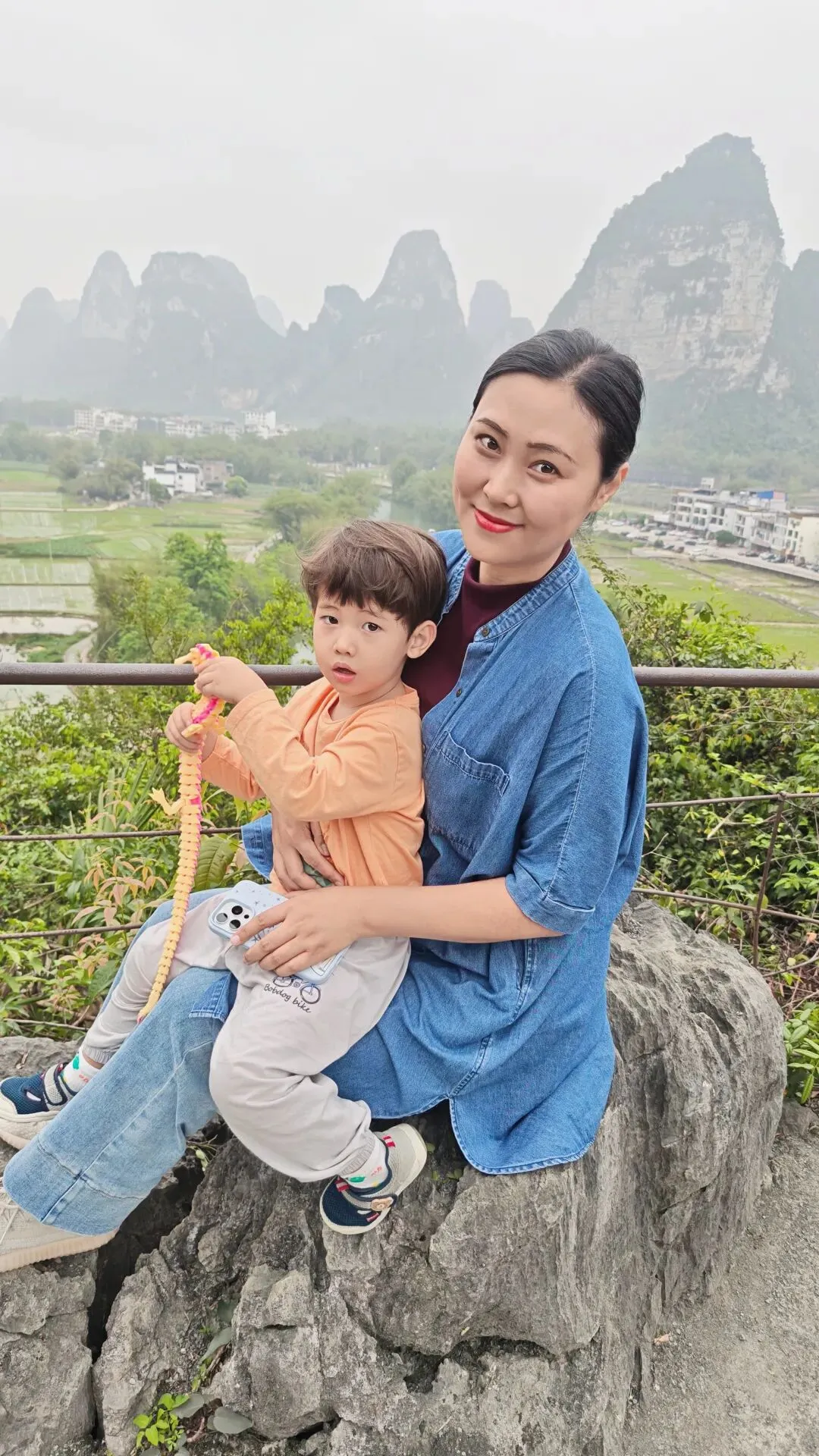 我看看那毫无特殊之处的铁门及门里面的状况,觉得一定是免费的。一家人走到门口刚想推门进去,那位貌似看闲的老头走了过来,说门票每人15元。我惊讶的问了一句,就这还要门票?老头笑着说,你上去就知道值这个钱了。我问有多高?老头说不高,也就100来米,就是有点陡。小宝姥爷嗤之以鼻,才100来米高,就算陡,眯着眼也上去了。我穿着10厘米高跟拖鞋,想着100米确实不算事。可是上了一段台阶后发现,真的很吃力。台阶太陡,我有三年没爬过山了,这么陡的上山台阶,走的非常吃力。从不运动锻炼的宝妈,更是走的上气不接下气,我虽然体力很棒,但也是气喘吁吁,小宝几乎不走都要姥爷抱着。一家老小就这大约100米的上山台阶,走走歇歇,歇歇走走,总算到了山顶观景台。站在龙头山观景台上,俯瞰整个明仕田园喀斯特山水的全景,的确如收门票的老头所说,景色绝佳,是观赏日出、日落的绝佳地点。只可惜今天是阴天且有雾气,那种瑰丽的落日余晖和晚霞是无缘相见了。