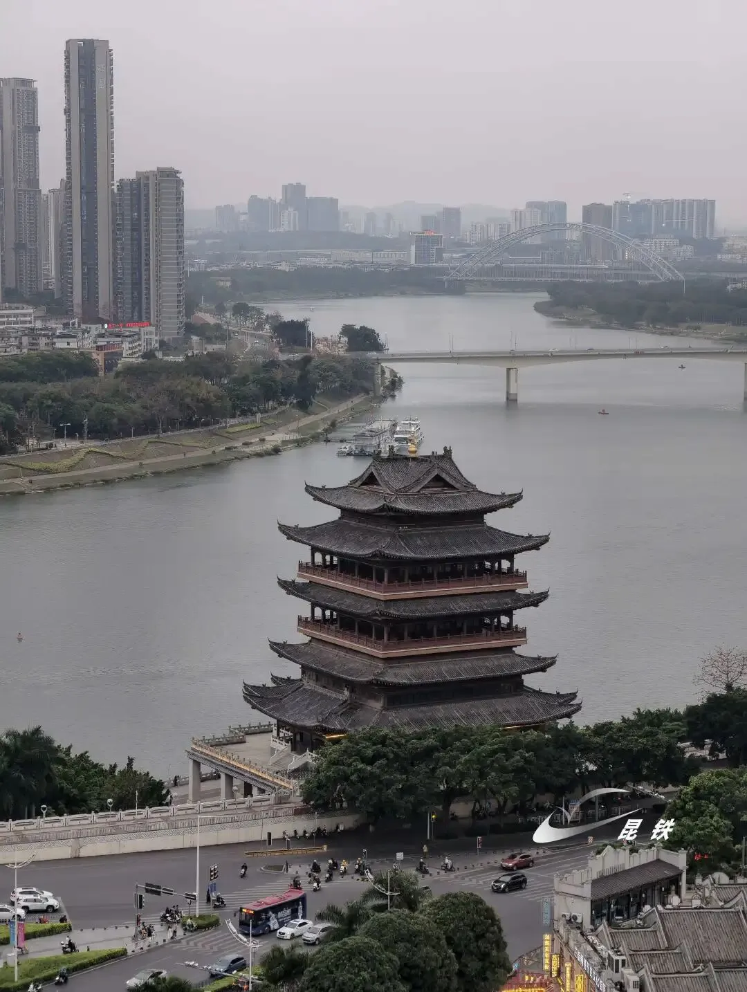 “一条玉带穿城过,半城绿树半城楼”