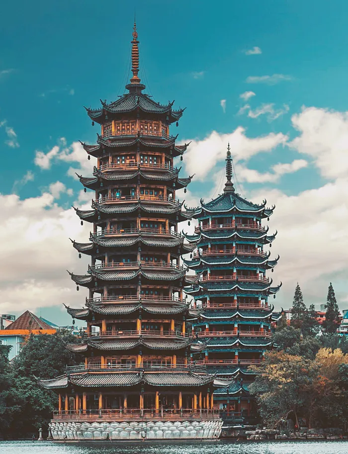 日月双塔的历史可以追溯到唐代,是在唐代佛塔的基础上重建的景观塔。日塔通体纯铜装饰,耗用铜材350吨,金碧辉煌,并有电梯供游客观光乘坐。月塔则为琉璃塔,古朴典雅