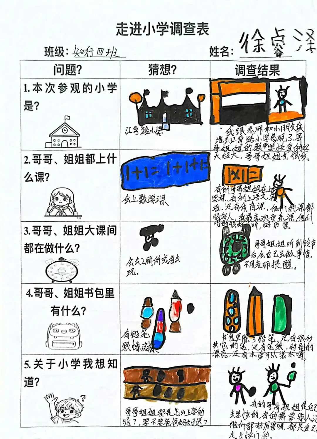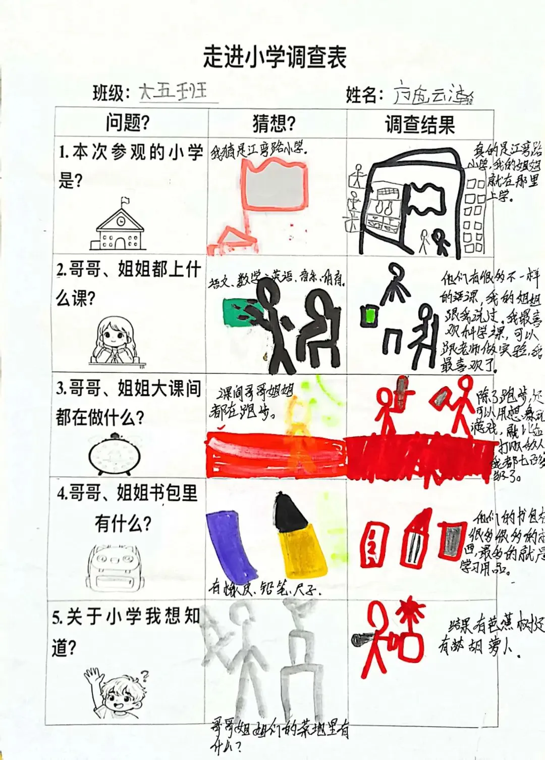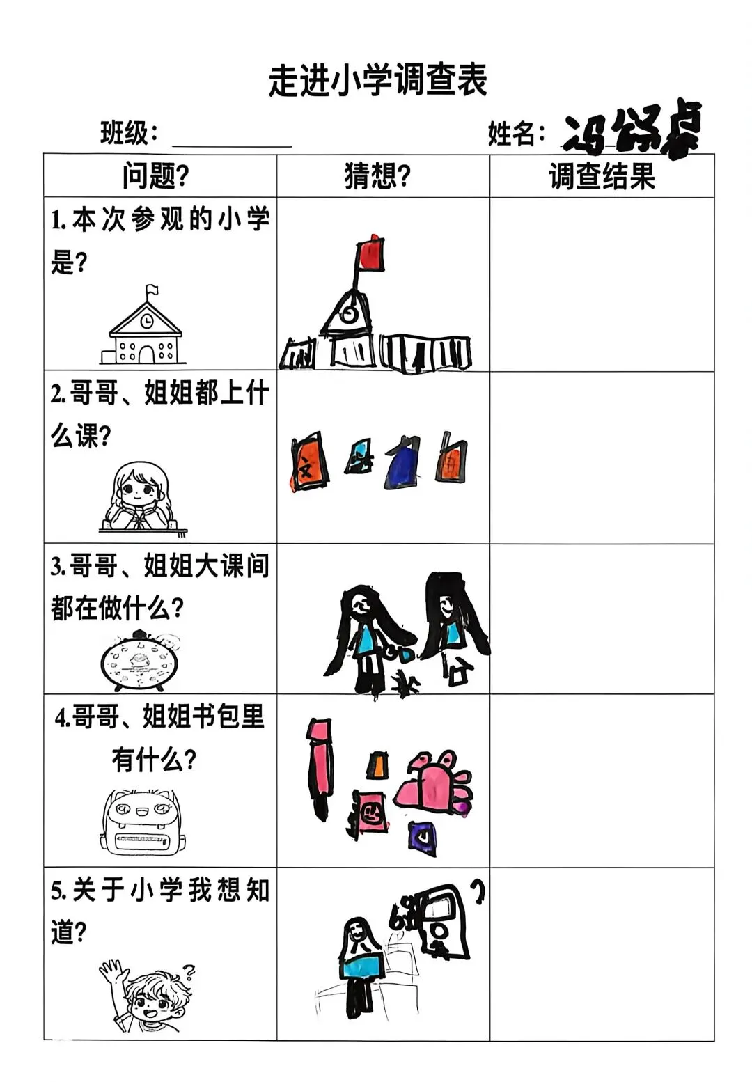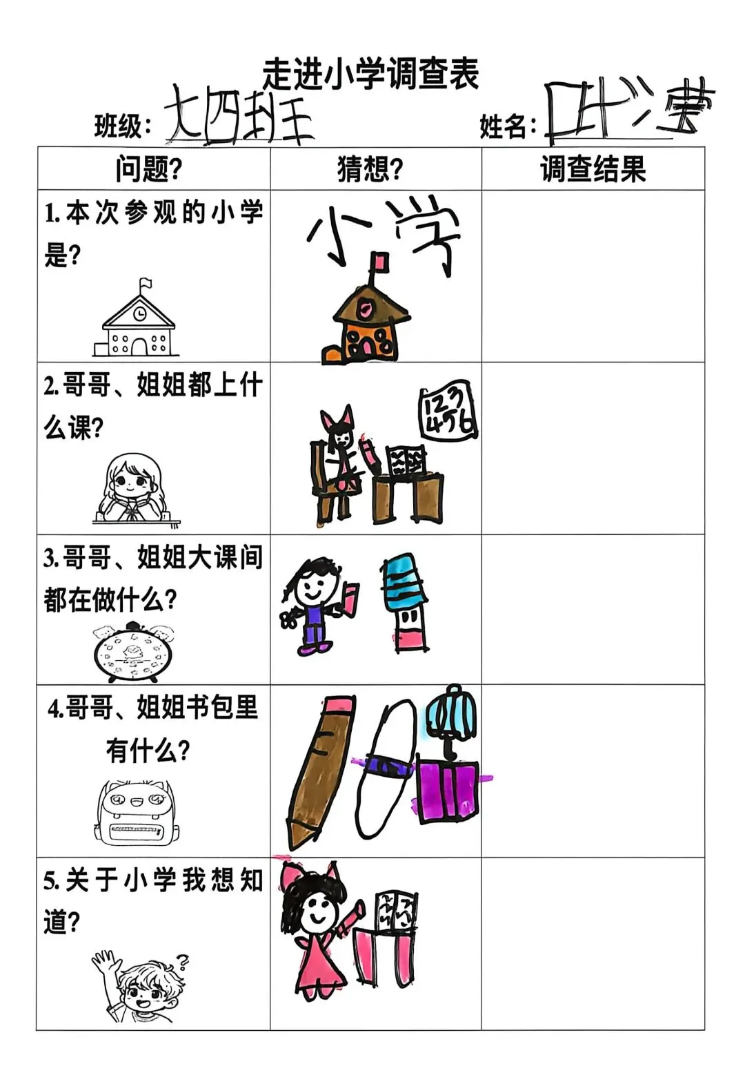 孩子们自主规划探秘内容,用绘画、符号完成调查表,锻炼观察思考与表达能力,梳理对小学的好奇与憧憬,做好参观前的心理准备,培养做事有计划的良好习惯。