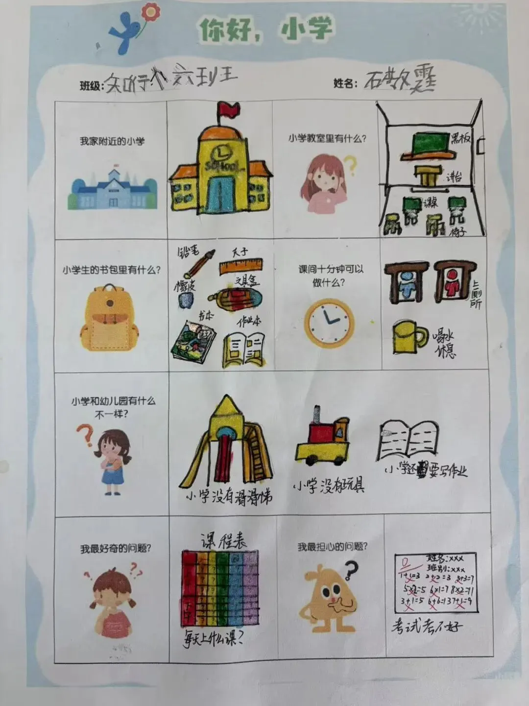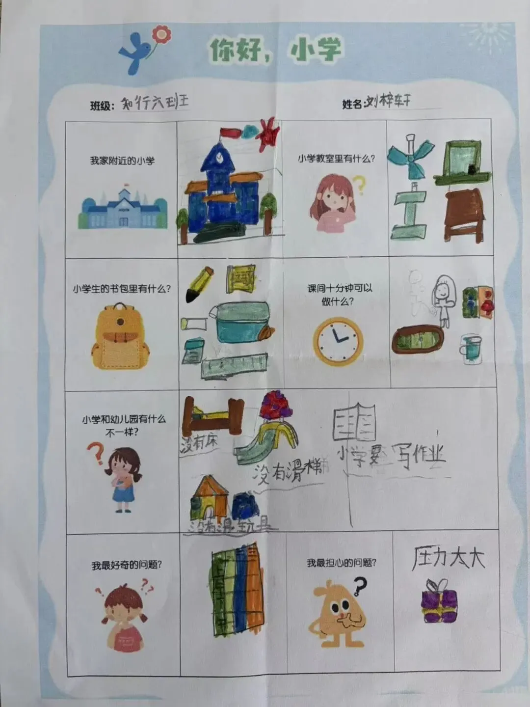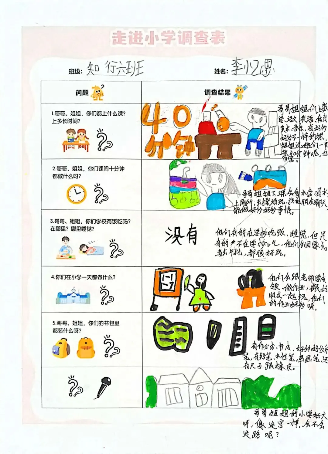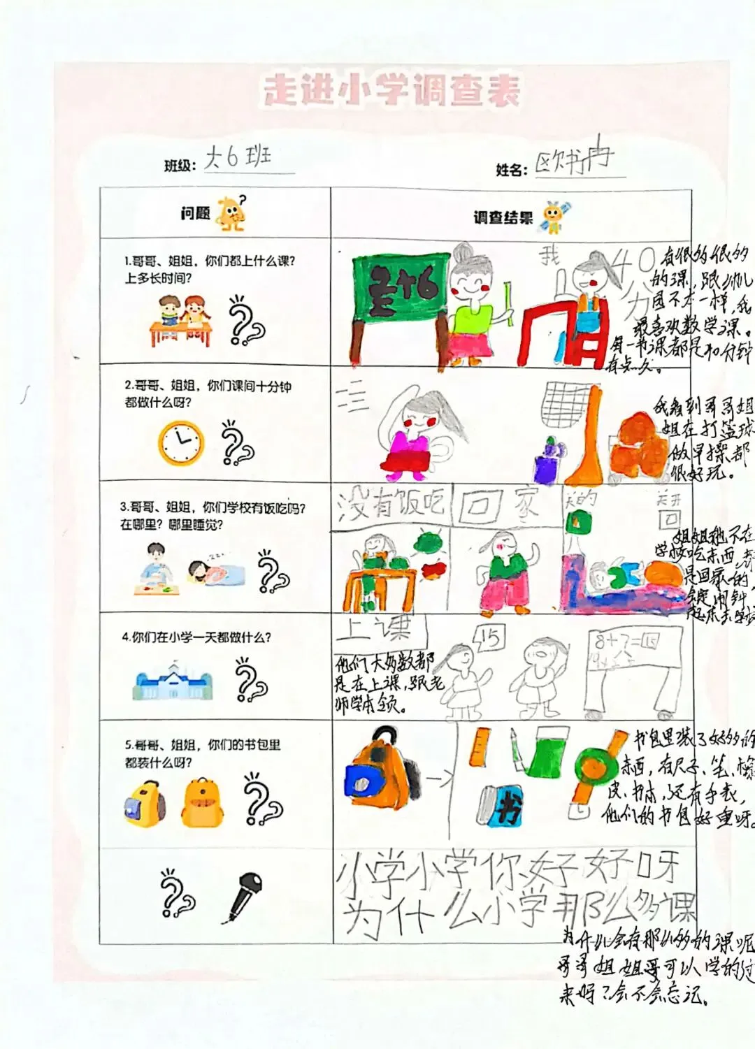 孩子们自主规划探秘内容,用绘画、符号完成调查表,锻炼观察思考与表达能力,梳理对小学的好奇与憧憬,做好参观前的心理准备,培养做事有计划的良好习惯。