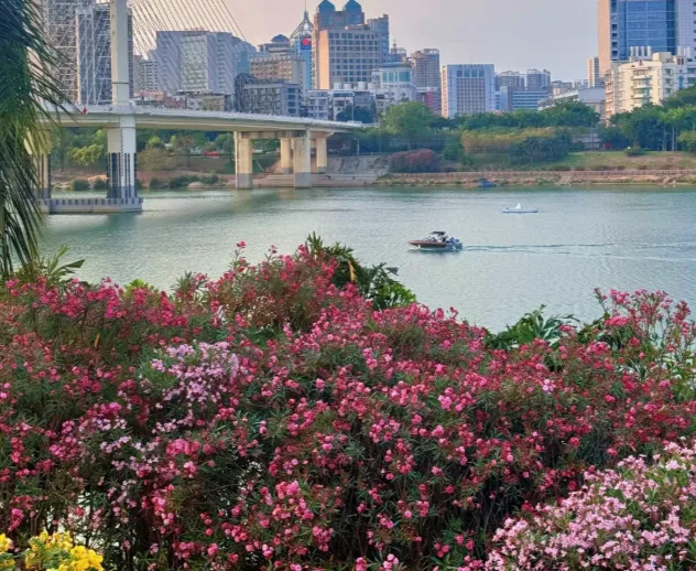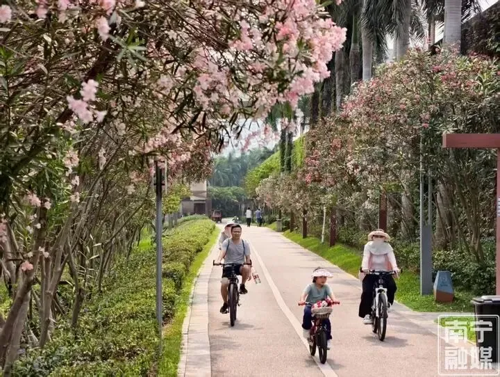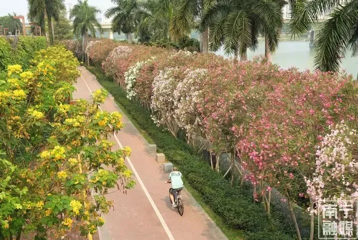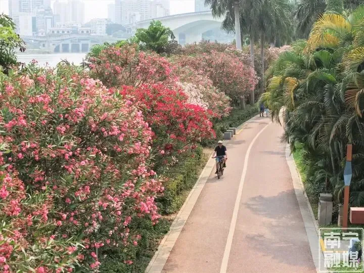 最近,南宁邕江边、青环路、五象大道等地,夹竹桃正“卷”得厉害——粉的、红的、白的花朵开得轰轰烈烈,仿佛在喊:“快来看我!快拍我!”