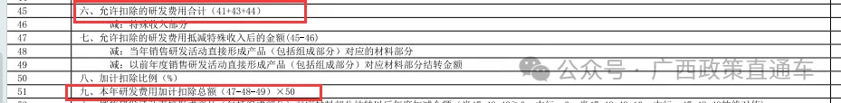 答:研发费用是“加计扣除明细表”中九、本年研发费用加计扣除总额(47-48-49)。