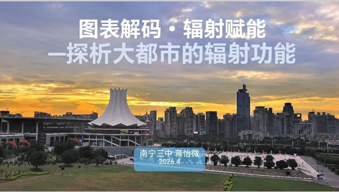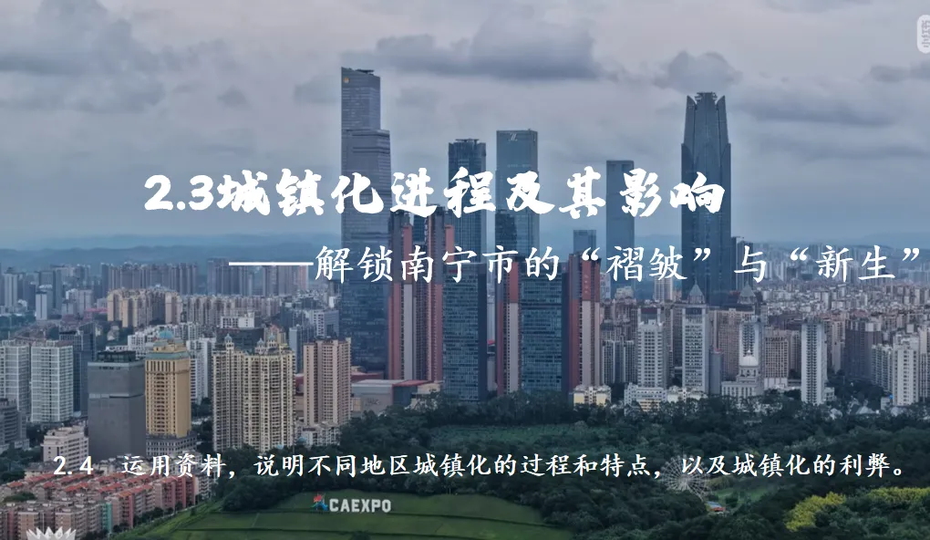 本节课以湘教版高中地理必修二《城镇化》为内容,紧扣课标要求,以南宁本土真实情境为载体,以 “城市褶皱”“三街两巷新生” 为主线,整合景观图、统计图等素材,分层开展探究活动。通过引导学生分析城镇化概念、过程与阶段特征,对比中外差异,提炼南宁产城文融合的城镇化智慧。课堂聚焦地理图表解读能力与综合思维培养,将知识学习、本土认知与核心素养落地有机统一。