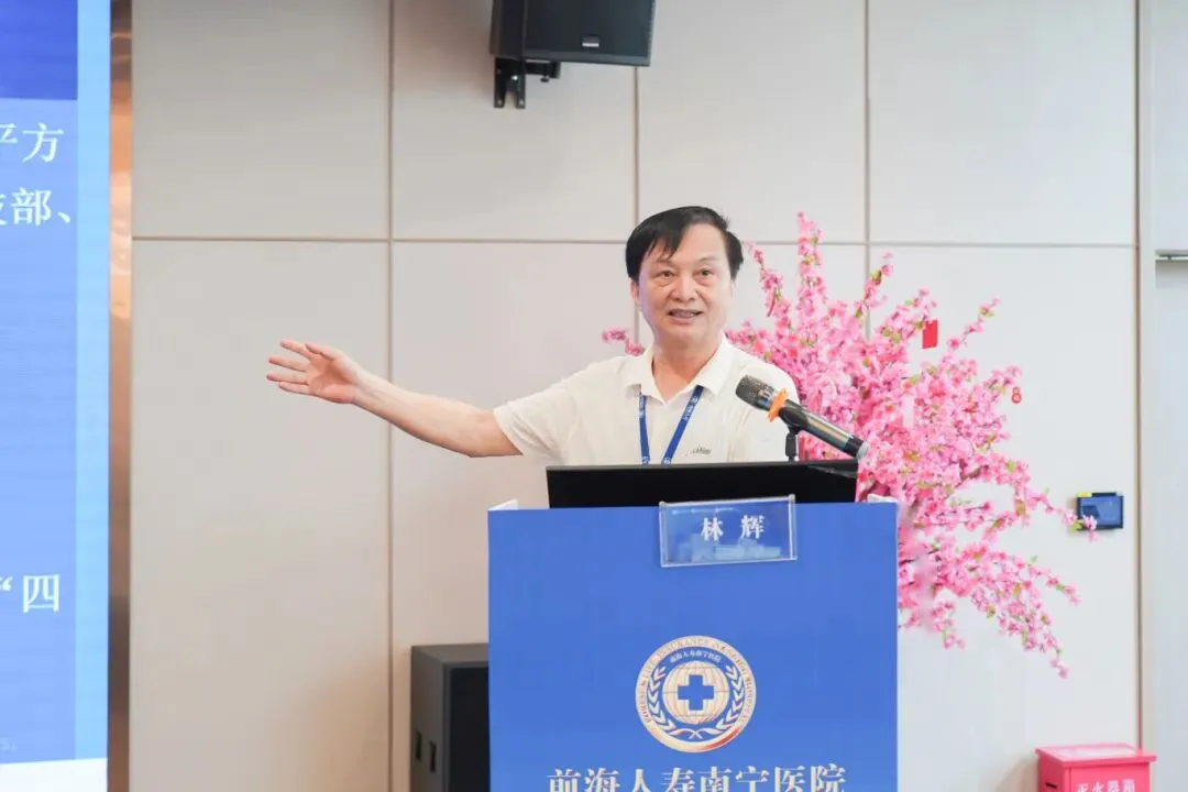 开班仪式上,前海人寿南宁医院院长林辉致欢迎辞,对在百忙之中莅临我院传经送宝的两位专家表示衷心地感谢,对全体与会护理同仁表示热烈欢迎。林辉院长结合我院“12345”战略目标,向两位专家及全体与会人员系统介绍了我院“医疗—康复—养老—善终”四维一体的新型医养融合模式。