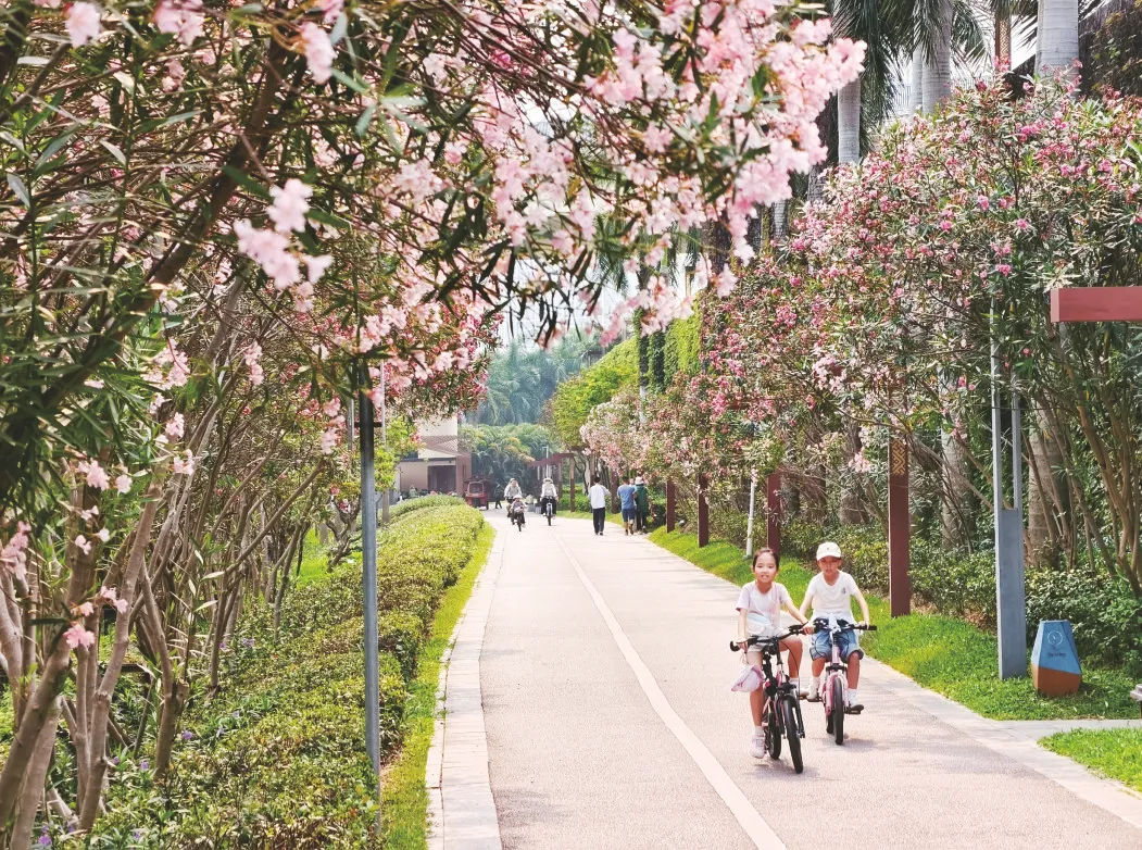市民在邕江边花间小径骑行。记者 宋延康 摄