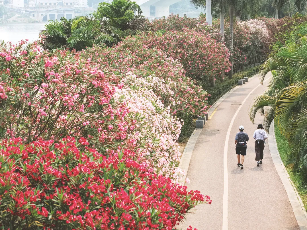 近日,路过邕江南岸公园(白沙大桥至葫芦鼎大桥段)骑行绿道,便能看到一道美丽的风景:上万株夹竹桃竞相绽放,或红或粉或白的花朵如瀑布般倾泻而下,与江水、天空以及骑行、散步的市民构成一幅美丽画卷。凭借超高颜值,这片绵延数百米的花墙成为新晋打卡点,吸引不少市民前往赏花。