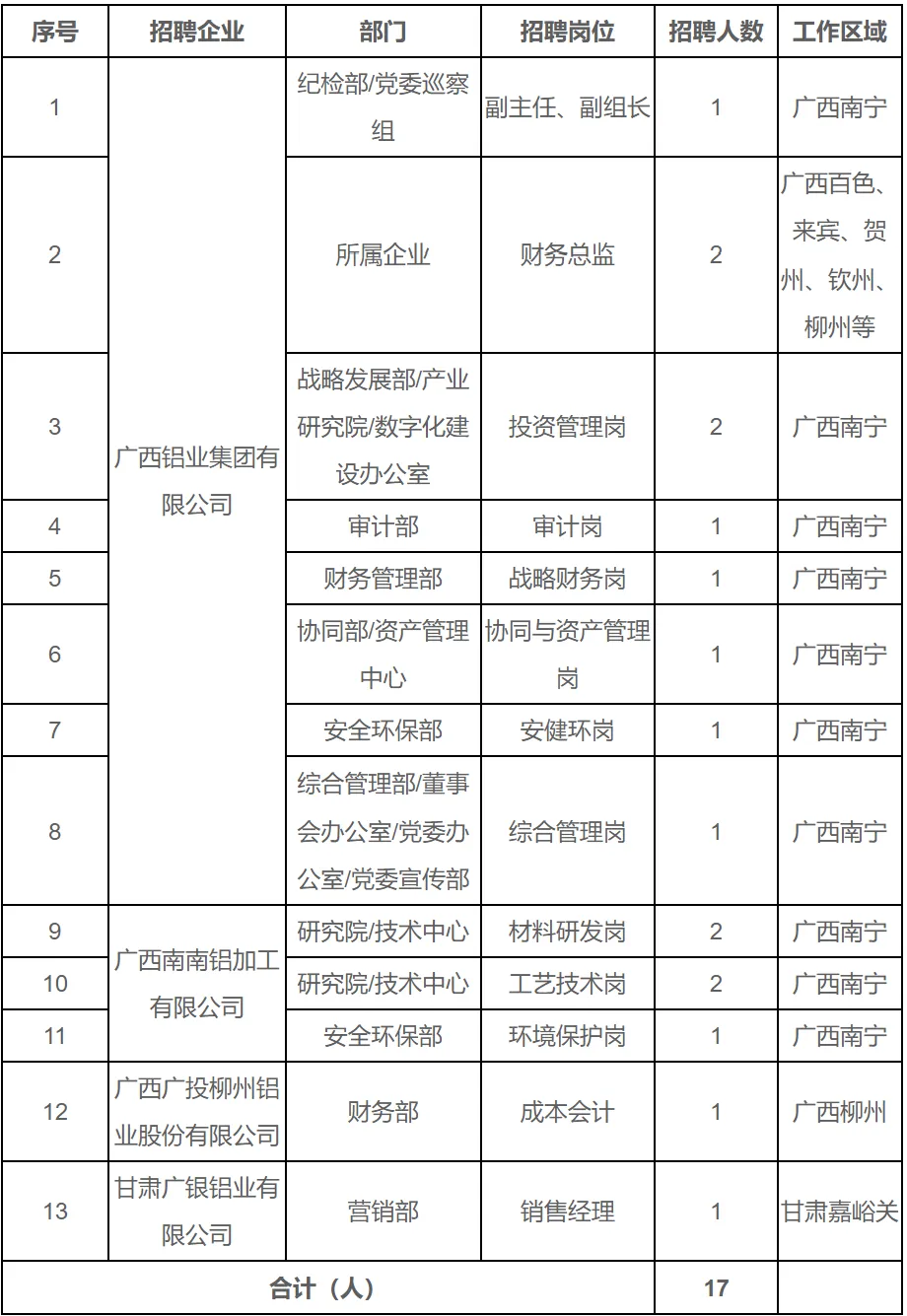 具体岗位及要求见《广西铝业集团有限公司2026年社会招聘岗位职责及资格要求》。