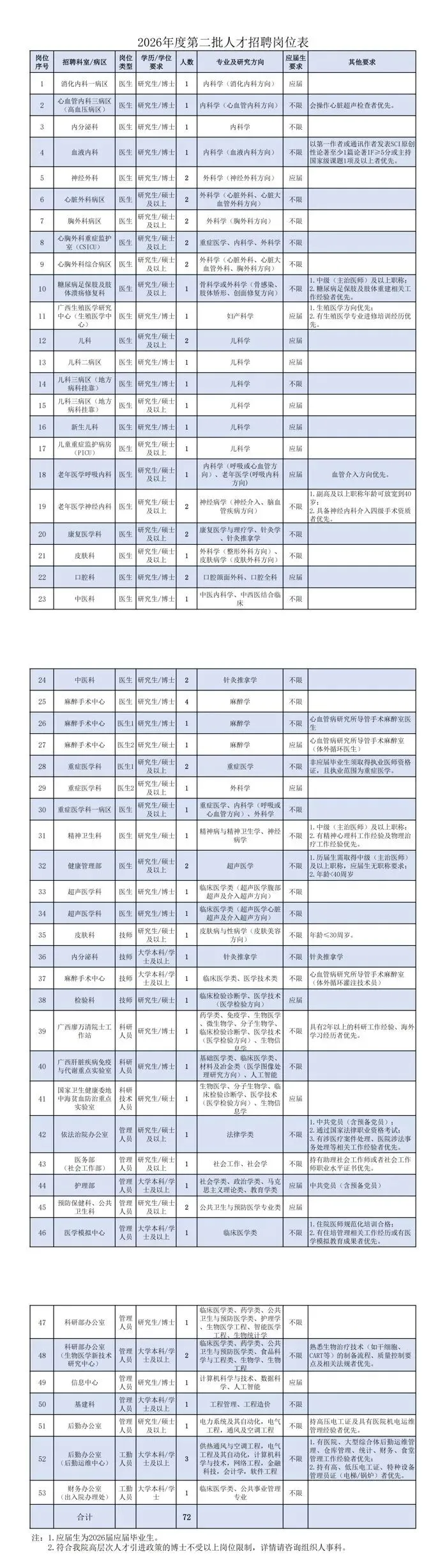 根据广西医科大学第一附属医院人才及学科发展需要,现面向社会招聘医师、技师、行政及科研等岗位人才72名。