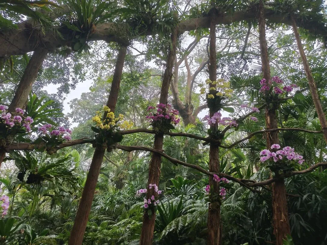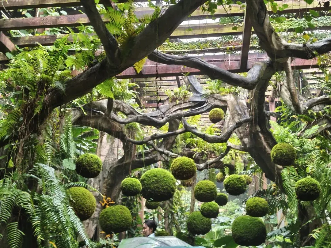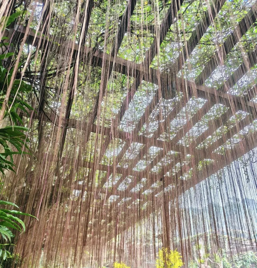 悬挂的苔藓球如一颗颗硕大的翡翠吊坠,圆润饱满,缀满虬曲枝干,漾开层层绿意。垂下的细细的气生根如棕红帘幕,自木质廊架倾泻而下,丝缕分明,真像是万条垂下“褐”丝绦。蕨类、草本丛生,浓绿层层叠叠,高高矮矮。