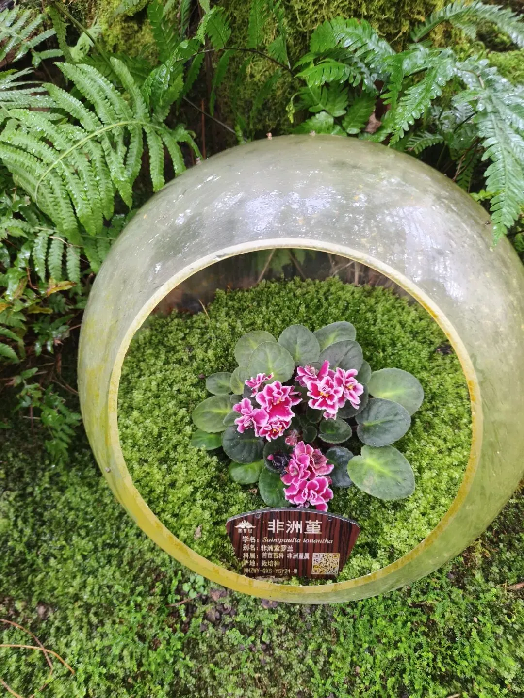 小巧的玻璃圆缸内,苔藓铺就翠绿绒毯,非洲堇与各色花草依偎其间,粉紫的花瓣在幽绿映衬下愈发娇柔。