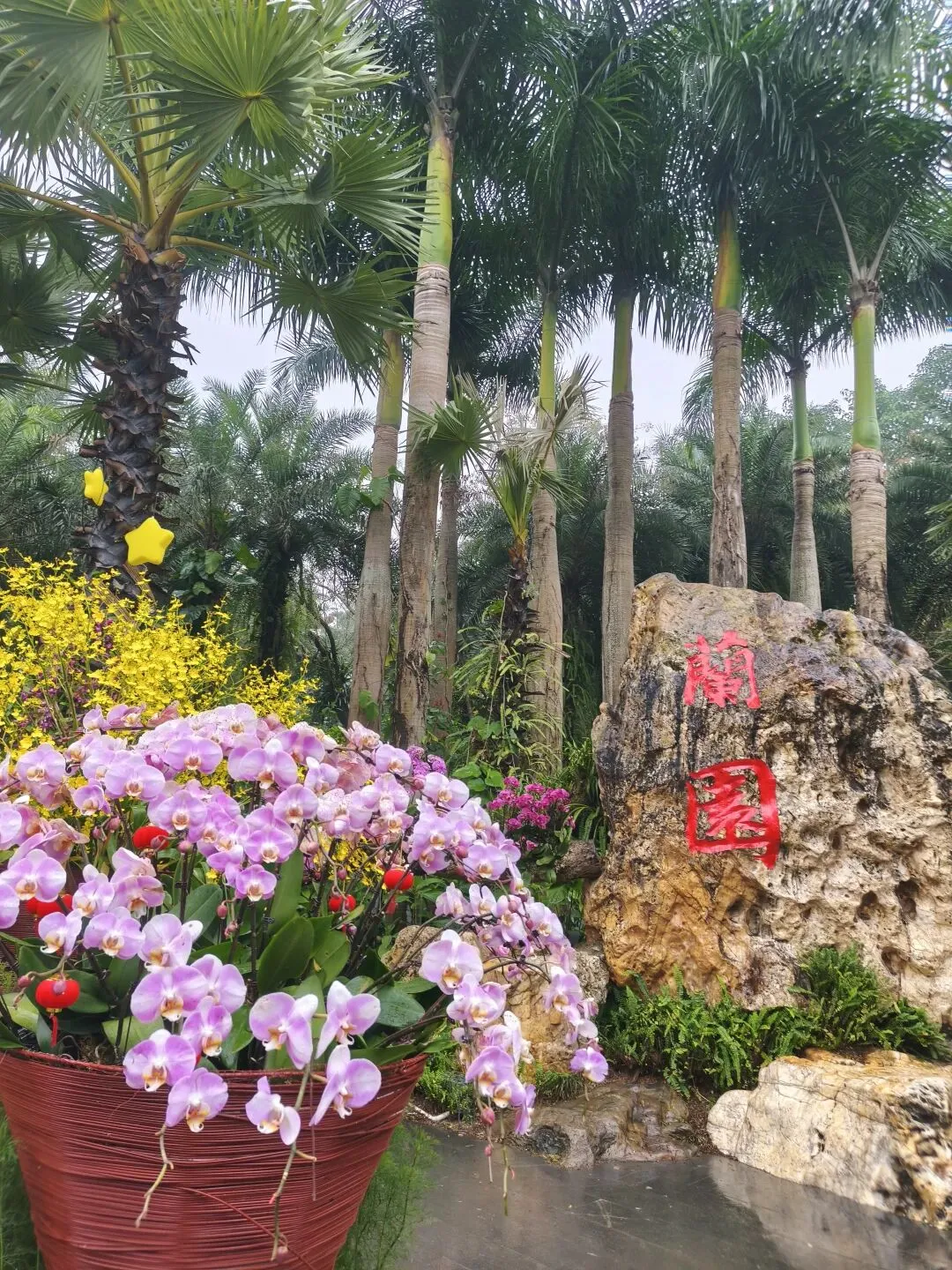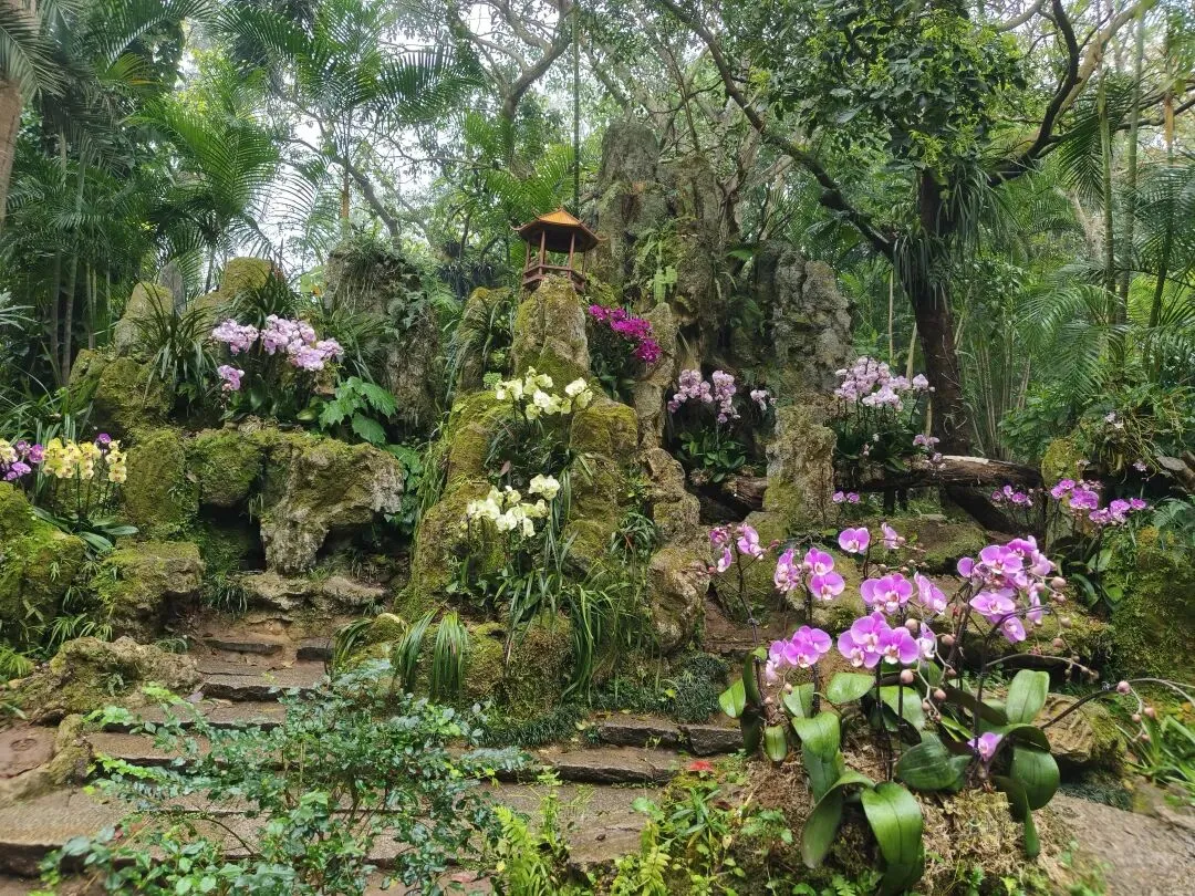 抬头看,巨石旁的蝴蝶兰舒展花瓣,粉紫如霞,明艳动人;苔藓覆石的假山间,白、玫红兰花错落绽放,幽香暗浮。
