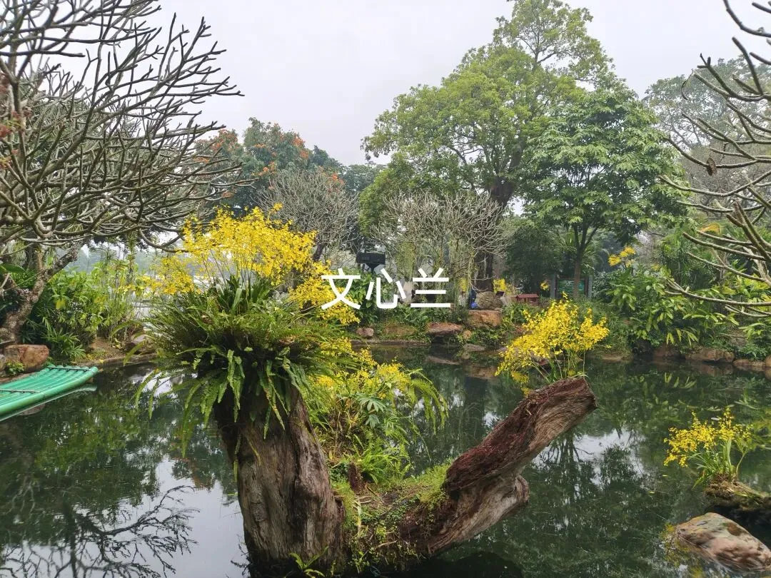 低头瞧,水面枯木上,文心兰缀满金蕊,似舞蝶翩跹。