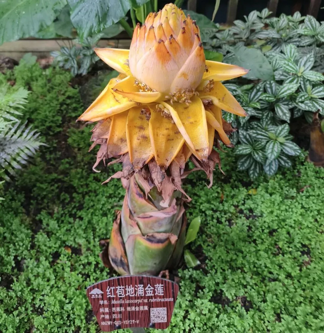 硕大的金黄色花仿佛从地下涌出,粗壮的茎干,托举起一轮不落的太阳:灿灿的“莲花”傲然挺立,金黄的苞片像花瓣一样层叠舒展,宛如佛前宝灯。