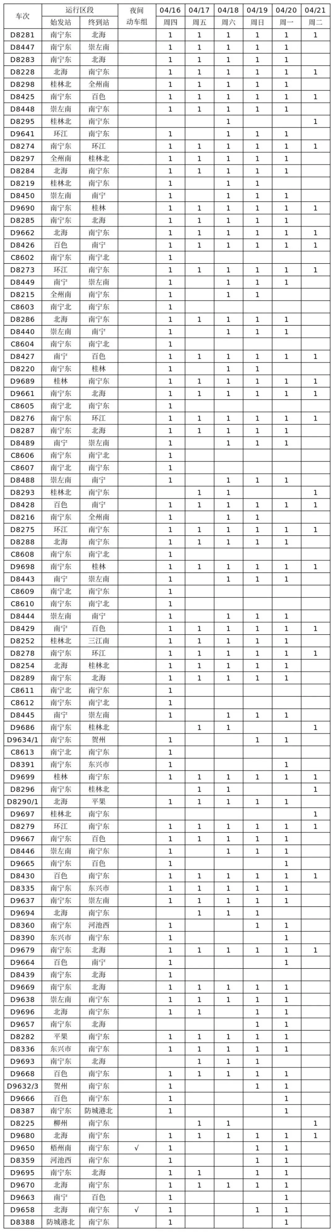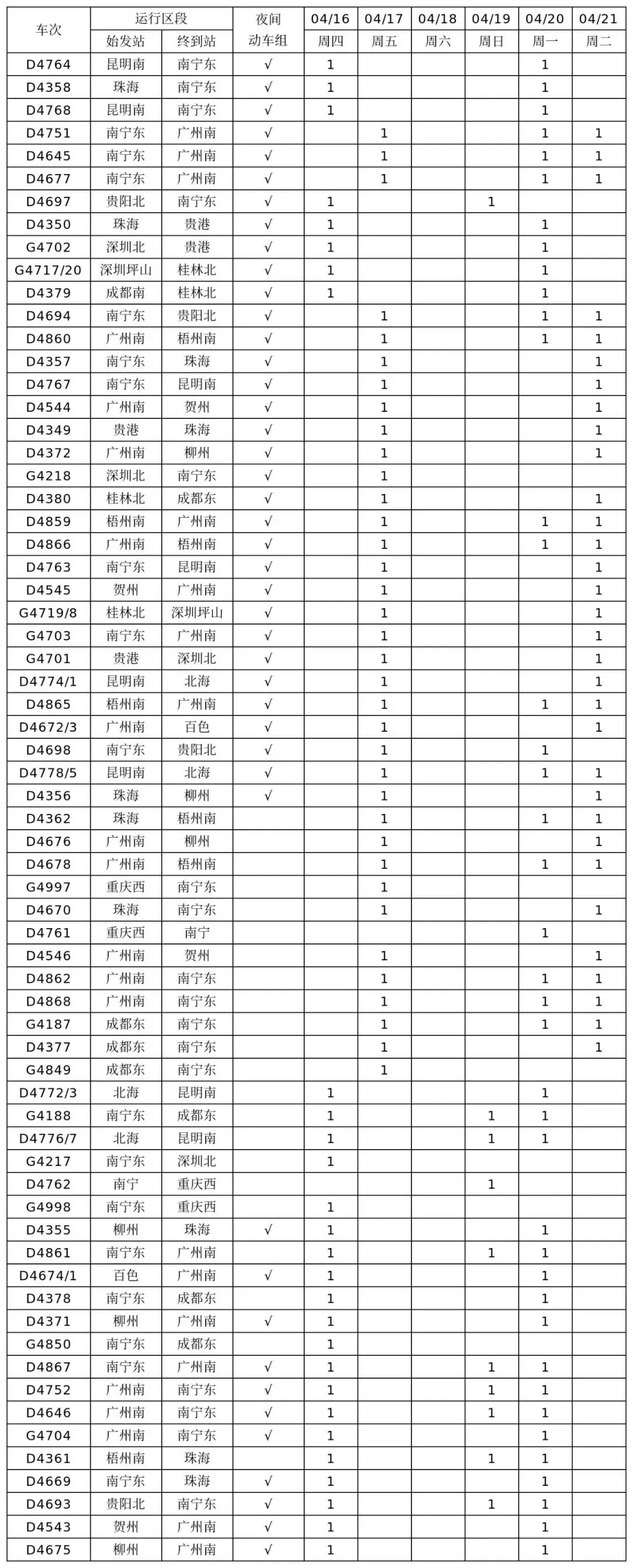国铁南宁局动车组加开汇总