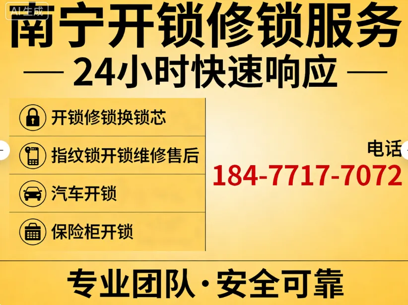 点击一键拨号:184-7717-7072在南宁生活,很多家庭都用上了指纹锁、电子锁,其中飞利浦指纹锁凭借可靠品质成为不少家庭的首选,方便又省心,可一旦出问题就特别让人着急:指纹识别失效、密码错误锁死、智能锁没电打不开、面板失灵进不了家……再加上出门忘带钥匙、门锁卡顿、钥匙断在锁里、汽车锁死、保险柜打不开等突发情况,越是紧急时刻,越需要专业、靠谱、响应快的南宁飞利浦指纹锁维修、南宁指纹锁开锁、开锁修锁服务。我们深耕南宁本地锁具行业多年,专注解决各类锁具故障,尤其擅长飞利浦指纹锁维修开锁,提供24小时上门开锁、换锁、修锁、智能锁安装维修等一站式服务,公安备案、持证上岗、价格透明,是南宁市民安心信赖的本地锁业品牌。