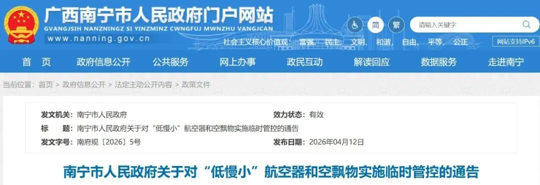 4月12日,南宁市人民政府门户网站发布关于对“低慢小”航空器和空飘物实施临时管控的通告,4月15日起主城区全域禁飞4天。详情如下: