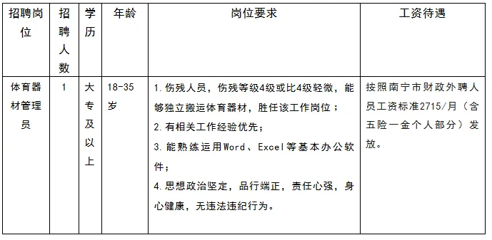 2.发送主题格式:姓名+体育器材管理员+手机号码简历接收截止时间:2026年4月20日业务咨询电话:0771-4739595(周老师)