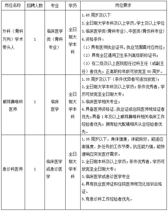 因工作需要,我院现面向社会公开招聘编制外外科学术带头人、眼耳鼻喉科、急诊科医师各1名,现将有关事项公告如下:
