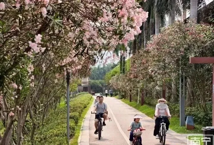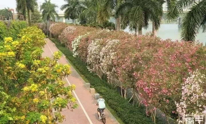 白沙大桥往葫芦鼎方向那段邕江南岸绿道,最近真有点东西。我骑车路过时差点刹不住车——整条路像被谁用花汁重新刷了一遍,红的、粉的、白的夹竹桃顺着护栏疯长,密密匝匝连成墙,风一吹,花瓣簌簌掉在骑行者的头盔上、单车把手上,甚至飘进咖啡杯里。真不是夸张,光是白沙桥到葫芦鼎这一截,就种着差不多一万株,绵延好几百米,比某些景区花海还野、还盛。