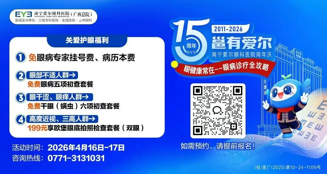 十五载守护光明,初心始终如一。值此15周年之际,南宁爱尔眼科医院周年庆感恩回馈,4月16日-17日暖心开启眼健康关爱眼病专场活动!预约即享:眼病科室专家挂号费全免、眼病初查套餐免费,用专业与服务守护您的双眼。