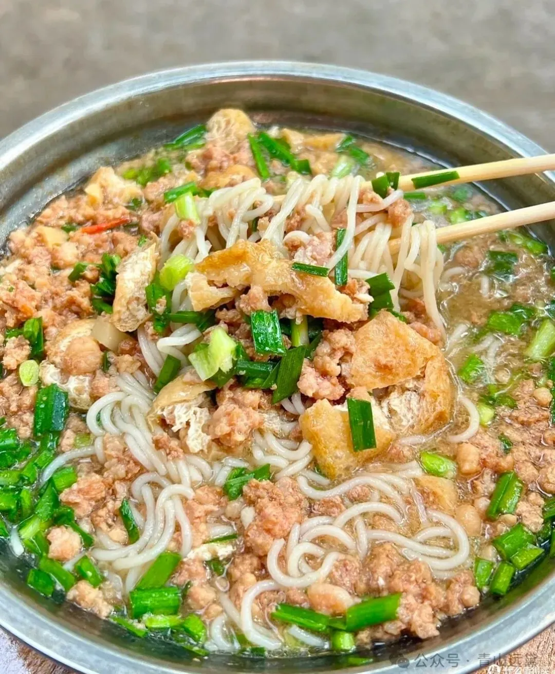 第二位的生榨米粉2016年列入广西非遗,南宁早餐点单率45%,水街、建政路老字号日均销量超600碗,被称为“南宁人的早餐灵魂”。大米发酵24小时现榨,带着独特微酸,配肉末、紫苏、骨头汤,爽滑劲道,是南宁独有的发酵米粉风味。