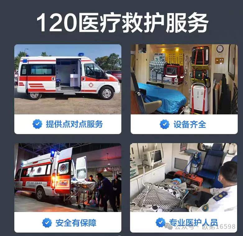 设备完善,安全达标:标配氧气供应、心电监护仪、吸痰器、急救药箱等专业急救与监护设备,车辆定期消毒维护,符合医疗转运标准。