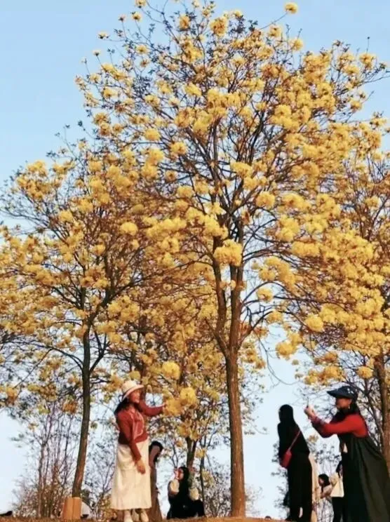 远远望去,一大片金黄浸染了大半个山坡。在蓝天白云下,黄花怒放,满目金黄。一簇簇,一朵朵,像一串串挂在枝头上的铃铛。踏入风铃谷中,风一吹,仿佛会摇出悦耳的铃声,奏响春天的乐曲。风动铃响,与繁花相和。美景入目,乐章盈耳,此诚浪漫之治愈盛宴也。置身其间,尘世喧嚣尽皆忘却,唯见黄绿相间之花毯铺于脚下,繁花簇拥之树林环绕四周,人若精灵,逍遥自在。