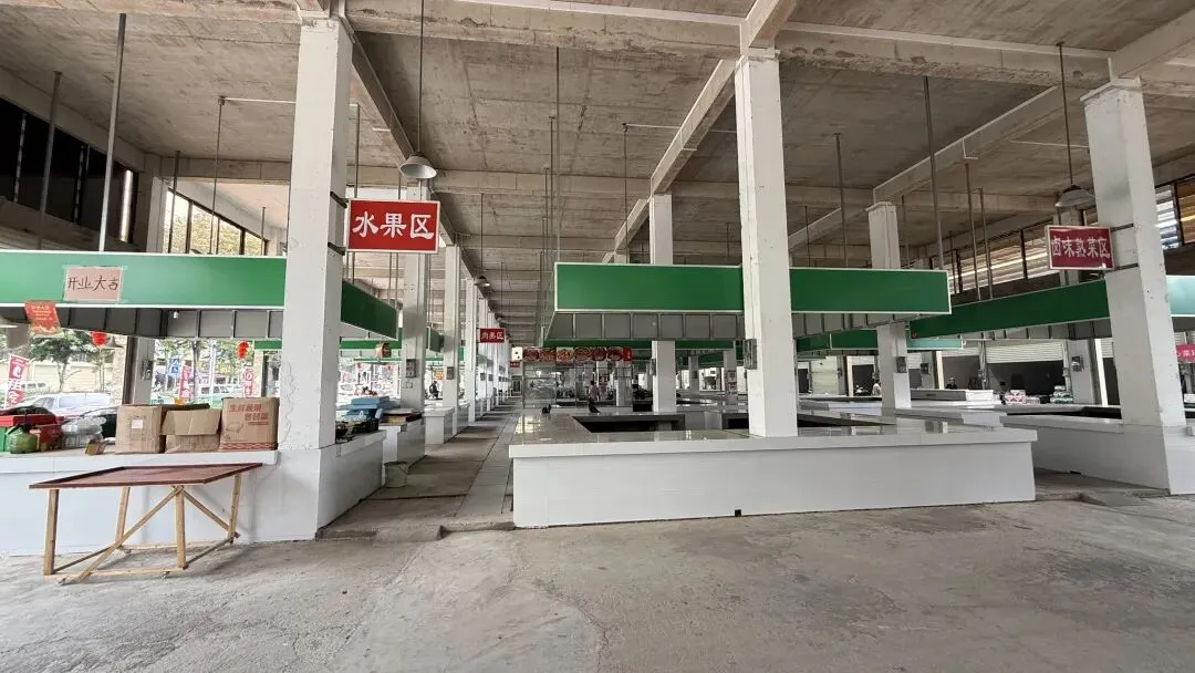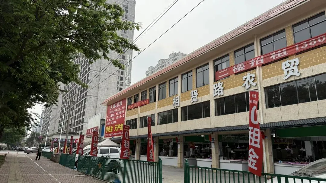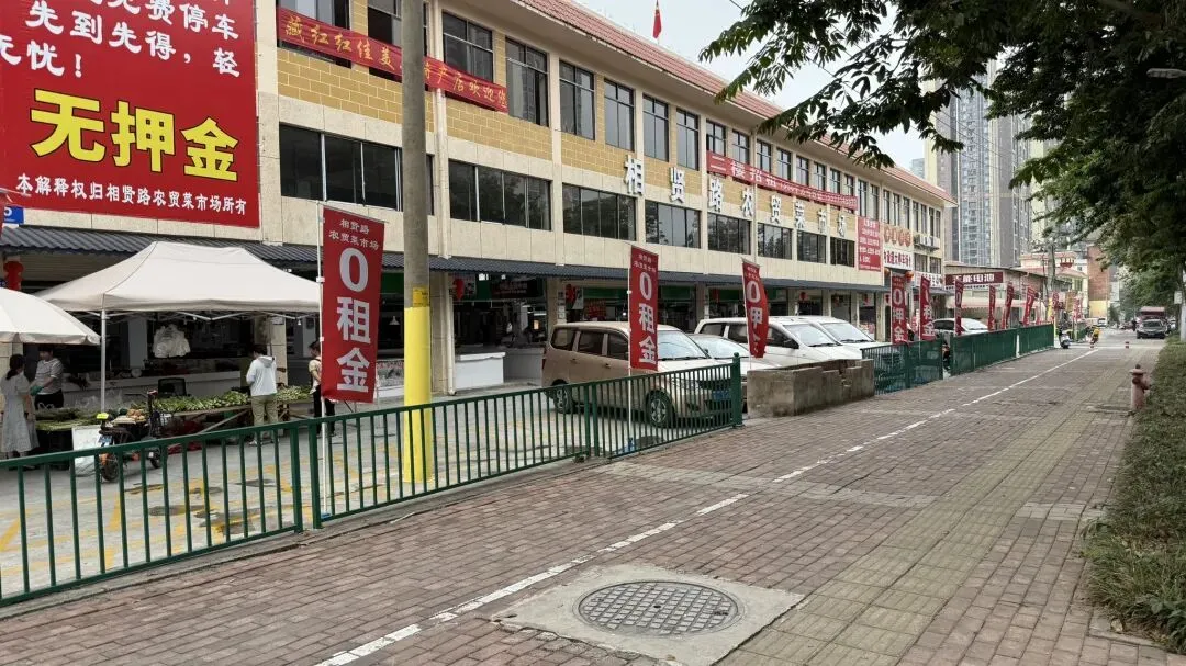 在大路边就可以看到这个菜市场了,边上它插满了它的小旗子:“0租金”➕“0押金”!