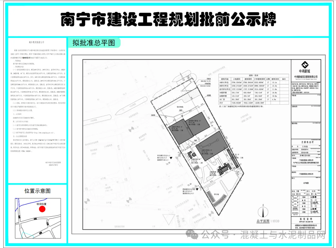 近日,南宁市邕宁区自然资源局发布“城乡规划批前公示(广西嘉润混凝土有限公司年产80万立方商品混凝土搅拌站整体搬迁项目)”。其中:1#砂石料仓建筑面积2766.30平方米,计容建筑面积5532.61平方米,建筑高度13.1米,层数1层;2#砂石料仓建筑面积1948.27平方米,计容建筑面积3896.55平方米,建筑高度15.3米,层数1层;备用砂石料仓建筑面积1757.31平方米,计容建筑面积3514.63平方米,建筑高度11.6米,层数1层;1#搅拌楼建筑面积655.66平方米,计容建筑面积748.41平方米,建筑高度19.8米,层数2层;2#搅拌楼建筑面积253.30平方米,计容建筑面积284.92平方米,建筑高度19.8米,层数2层;1#厂房建筑面积261.28平方米,计容建筑面积261.28平方米,建筑高度4.5米,层数1层。来源:南宁市邕宁区人民政府门户网站