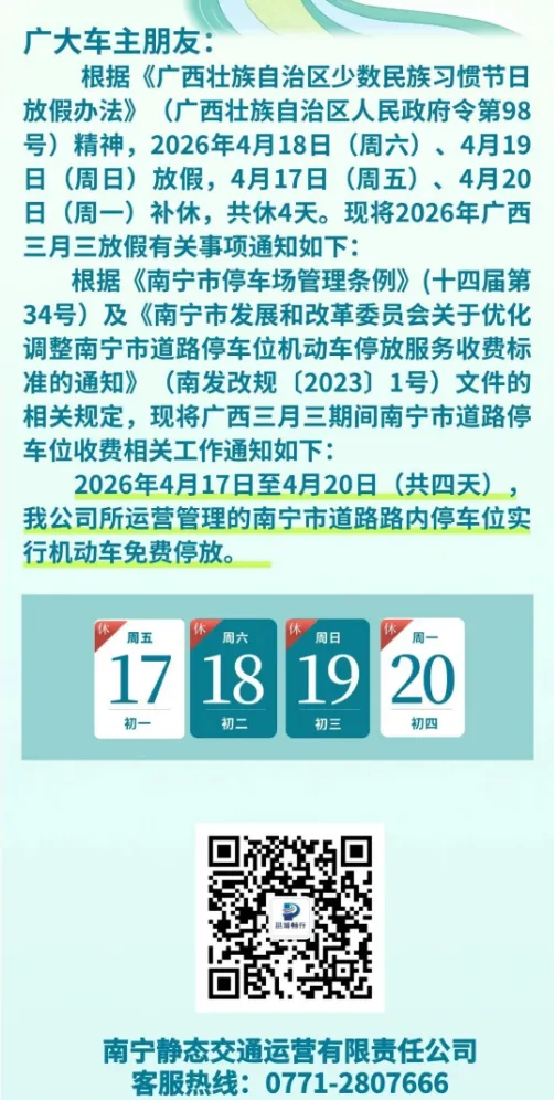 2026年4月17日至4月20日(共四天),我公司所运营管理的南宁市道路路内停车位实行机动车免费停放。